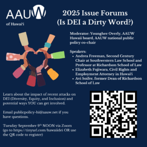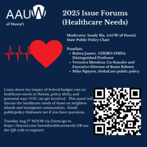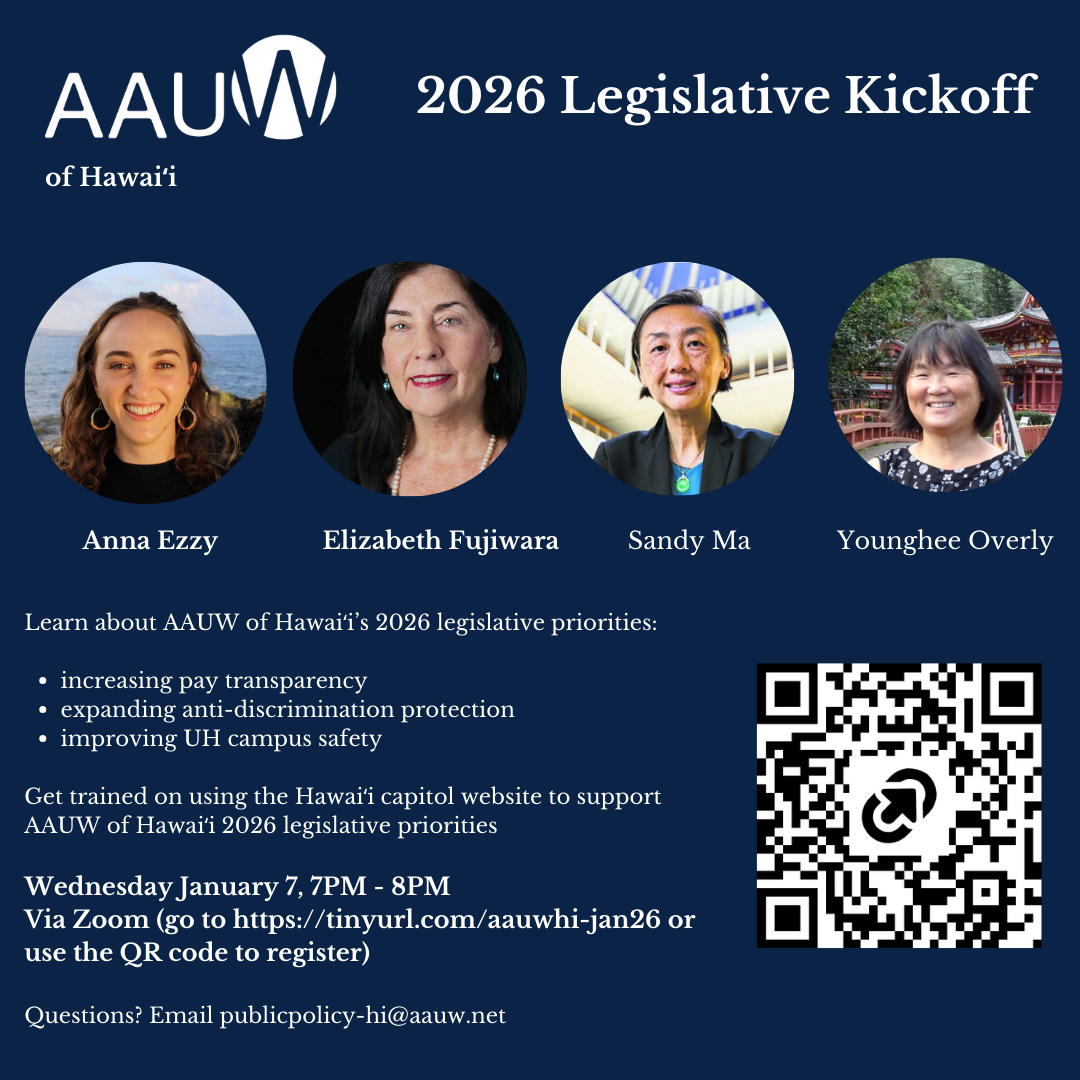 Join the AAUW Hawaii public policy network if you want to be notified of AAUW Hawaii’s 2025 legislative work and lobby day.
